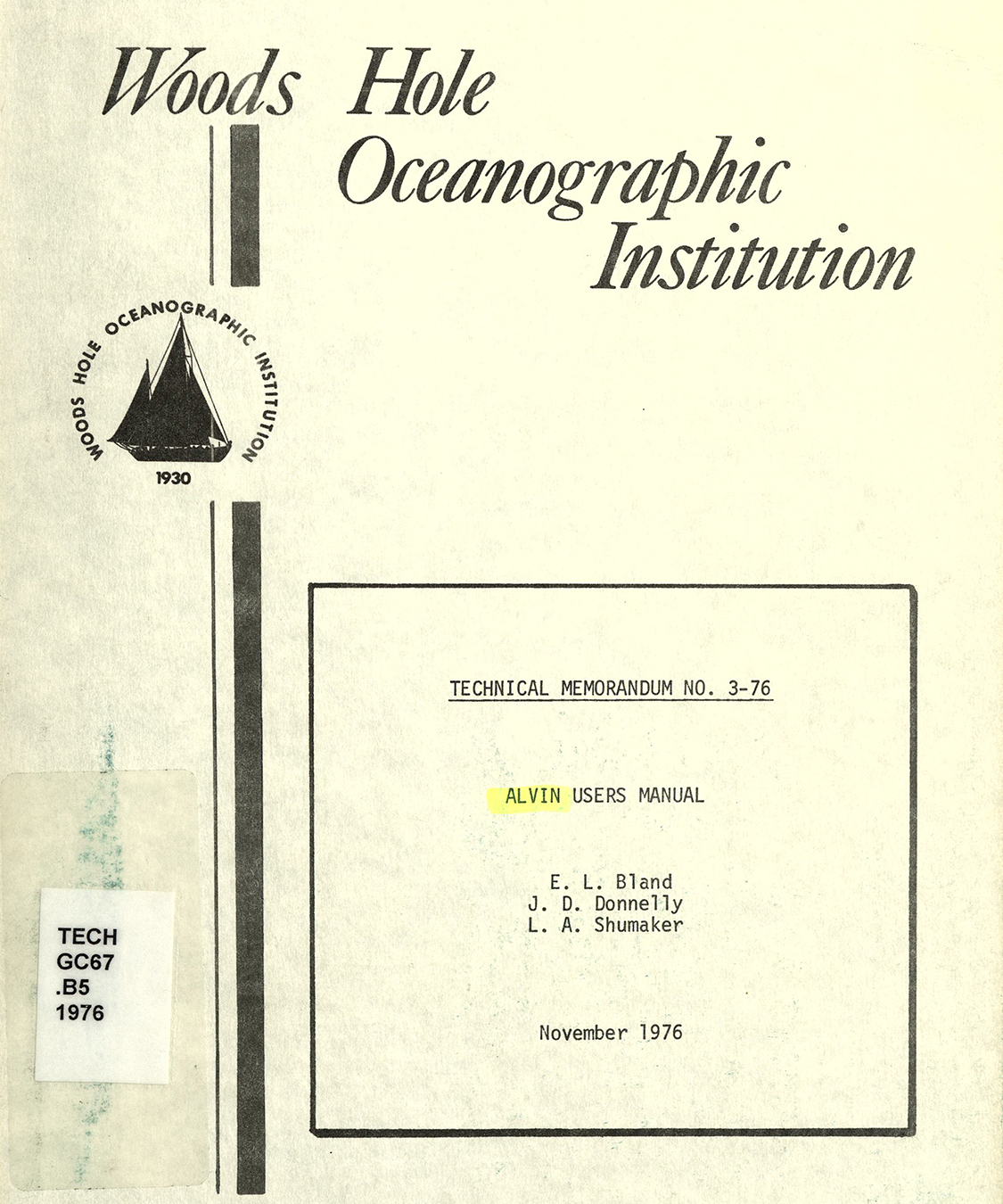Woods Hole Oceanographic Institution Technical Memorandum 6-75, November 1976