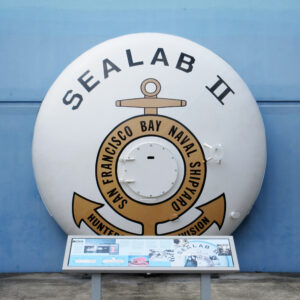 Sealab II was designed and built at Hunter’s Point Naval Shipyard in San Francisco. Fifty feet long with a 12-foot diameter, it contained four separate areas: an entry, a laboratory, a galley, and living spaces. The redesigned exterior of Sealab II featured two end bells that were fashioned through explosive metal shaping, a very technologically advanced method at the time. After a one-inch thick piece of flat steel was placed over the concave side of a dome-shaped die, one hundred pounds of C-4 plastic explosive were attached to the steel. The C-4 was detonated at 30 feet underwater in the San Francisco Bay, forming each end bell in 0.004 seconds.
