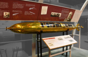 Howell tested his torpedo over the next ten years and produced an improved, working model by 1881. Congress appropriated $100,000 for the development of U.S. torpedoes in 1883 and LCDR Howell competed in a design contest later that year before the Torpedo Board. The other two competitors proposed surface-running, rocket-propelled torpedoes; only Howell’s was recommended for further consideration. The Navy paid for the manufacture of three Howell torpedoes and began extensive testing with them. With successful working prototypes in1886, Howell sold his patent rights to Hotchkiss Ordnance Company in Providence, Rhode Island, in 1888. The Navy ordered 50 Howell torpedoes in 1889, but Hotchkiss spent four years testing the design before finally putting it into production.