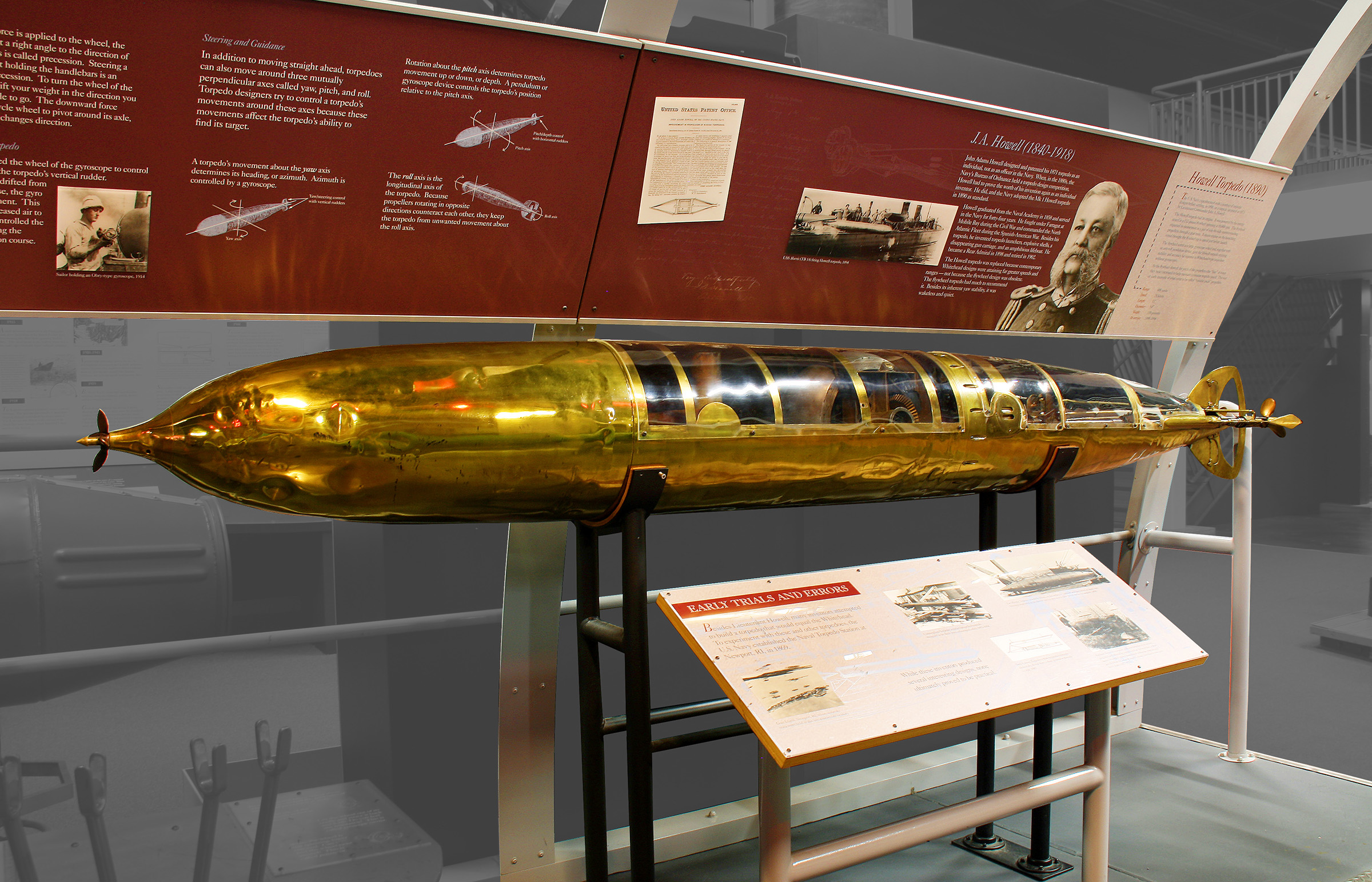 Lieutenant Commander John A. Howell, the head of the Department of Astronomy and Navigation at the U.S. Naval Academy, began developing his locomotive torpedo in 1870. Howell developed key improvements to existing torpedo technology and patented two of them in 1871: (1) propulsion via a heavy flywheel spun before launching, and (2) installation of the flywheel to also function as a gyroscope and directionally stabilize the torpedo. These ingenious engineering features became defining characteristics of the Howell torpedo.